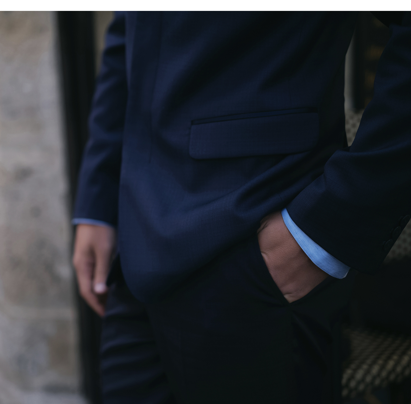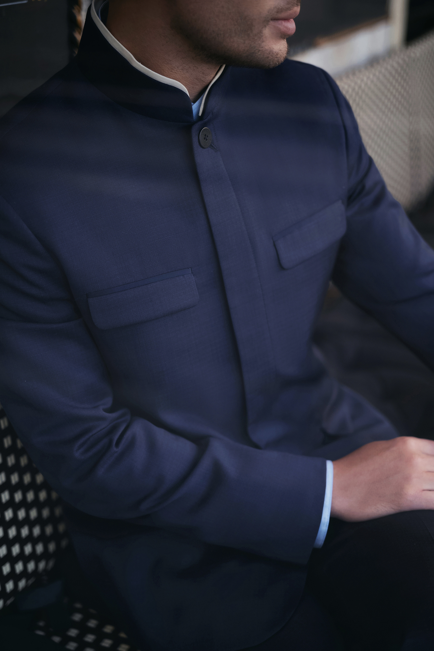 甄選義大利Cerruti羊毛面料,深藏青色細格紋外套重現經典中山裝的設計細節,瀟灑套裝盡展紳士型格,舉手投足間流露雅致格調。